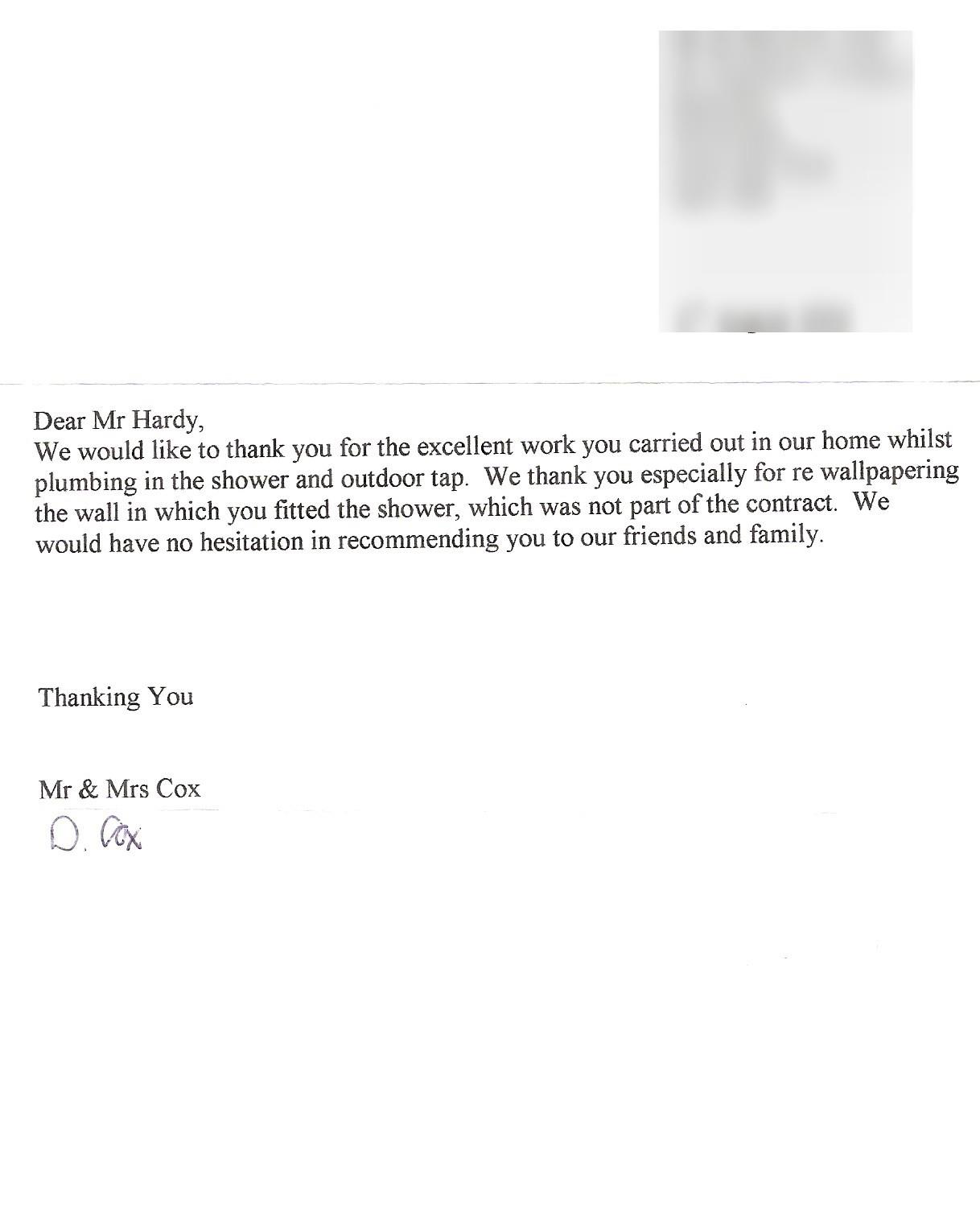 "We would like to thank you for the excellent work you carried out in our home whilst plumbing in the shower and outdoor tap. We thank you especially"...