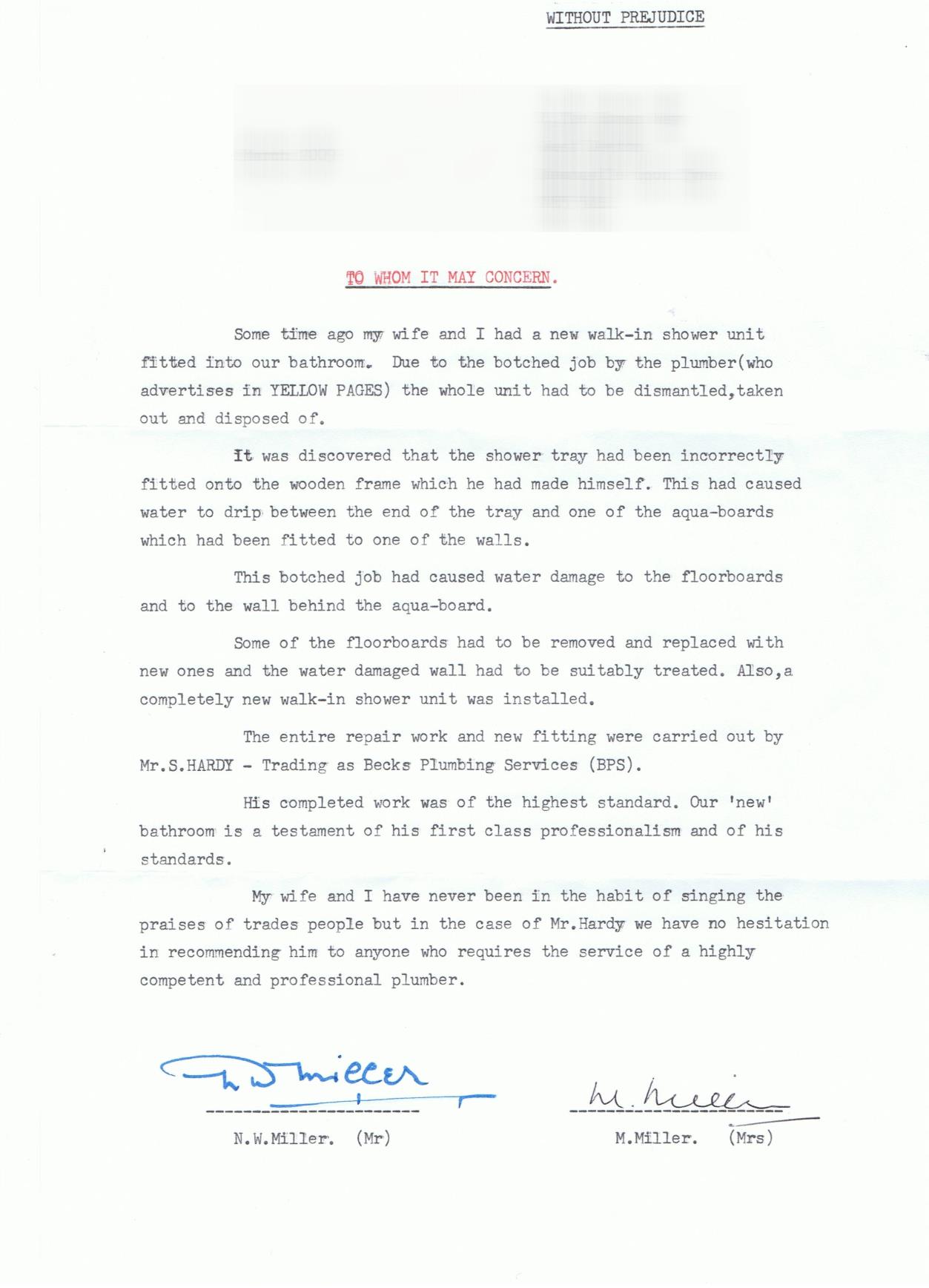 "The entire repair work and new fitting were carried out by Mr. S. Hardy - Trading as Becks Plumbing Services (BPS). His completed work was of the highest standard. Our 'new' bathroom is a testament of his first class professionalism and of his standards"...